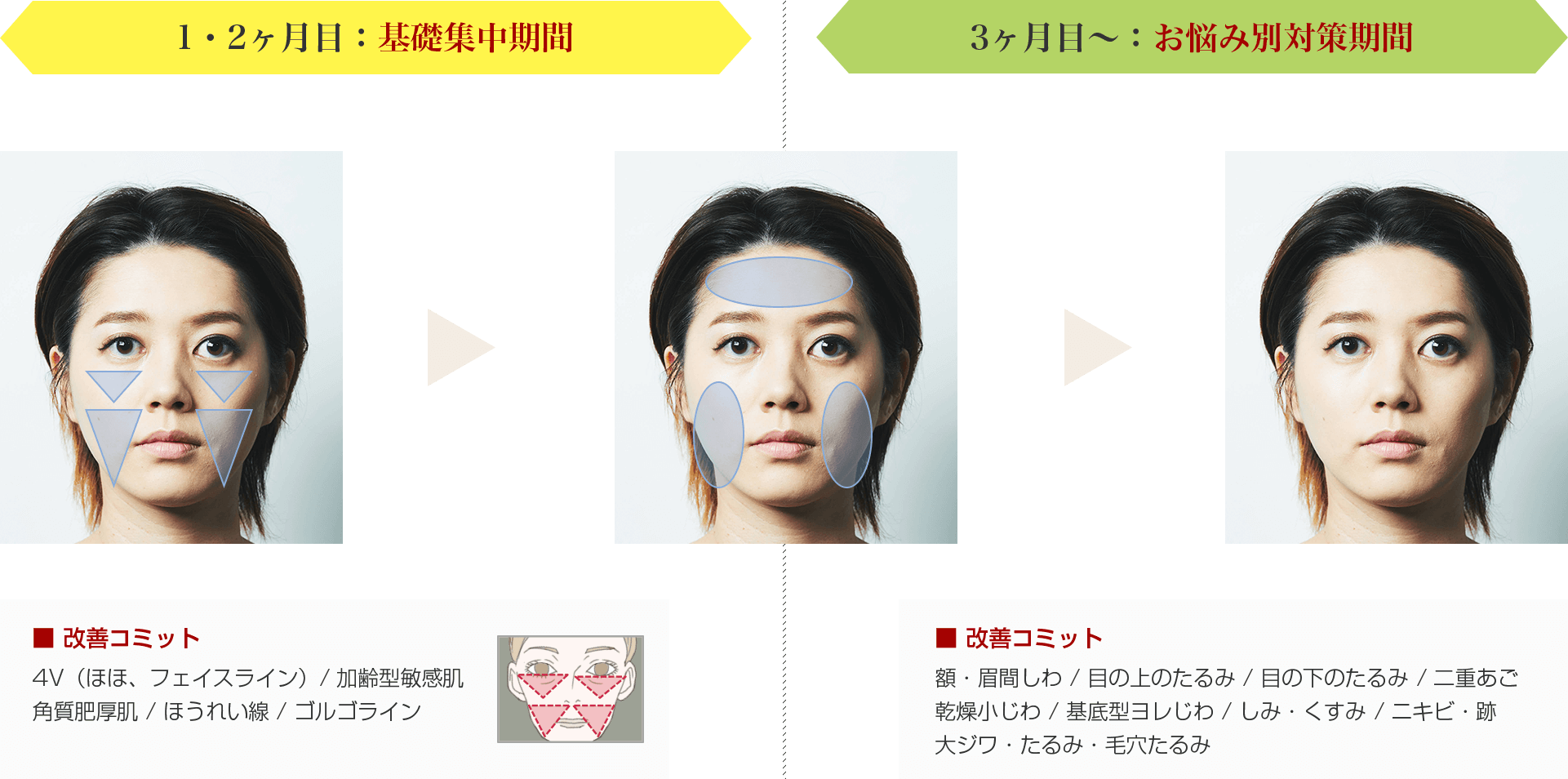 そのため最初の2ヶ月で集中して顔と肌の基礎づくりをし、3ヶ月目以降に一気にすみずみを鍛え上げていく、